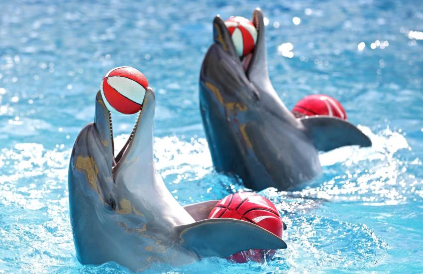 - Watch dolphins perform jumps, tricks, and show routines in a lively indoor arena.